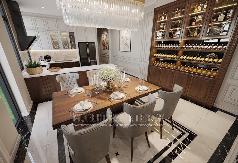 Bố trí phòng ăn lồng phòng bếp hiện đại tạo nên không gian vừa đẹp vừa tiện nghi vừa sang trọng.