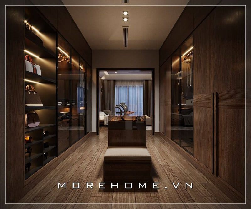 Mẫu thiết kế nội thất biệt thự đẹp với không gian phòng thay đồ tông màu nâu trầm tinh tế , sử dụng gỗ tự nhiên cao cấp mang đến không gian sống lí tưởng cho gia chủ