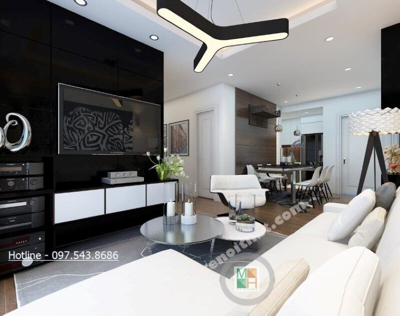 Thiết kế nội thất phòng khách chung cư với gam màu trắng chủ đạo mang đến cảm giác tinh tế và thanh thoát cho không gian