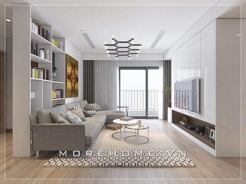 Kệ tivi hiện đại gỗ công nghiệp acrylic bóng gương càng làm cho không gian phòng khách chung cư hiện đại 2 phòng ngủ thêm cuốn hút và sang trọng.