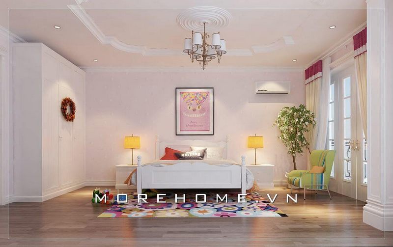 Nội thất phòng ngủ bé gái với tone màu trắng chủ đạo, sàn gỗ màu nâu trầm khơi gợi cảm giác ấm cúng cho căn phòng thêm thoải mái nhất