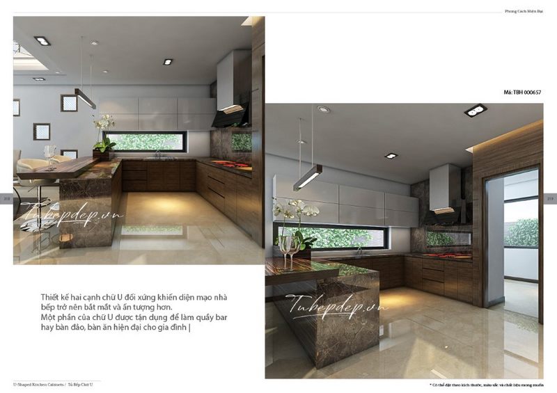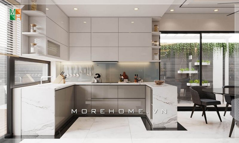 Nội thất phòng bếp biệt thự, nhà phố được thiết kế linh hoạt bằng cách sử dụng đá gỗ, tạo nên một cảnh quan sang trọng và ấn tượng.