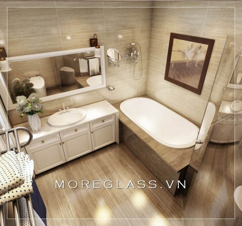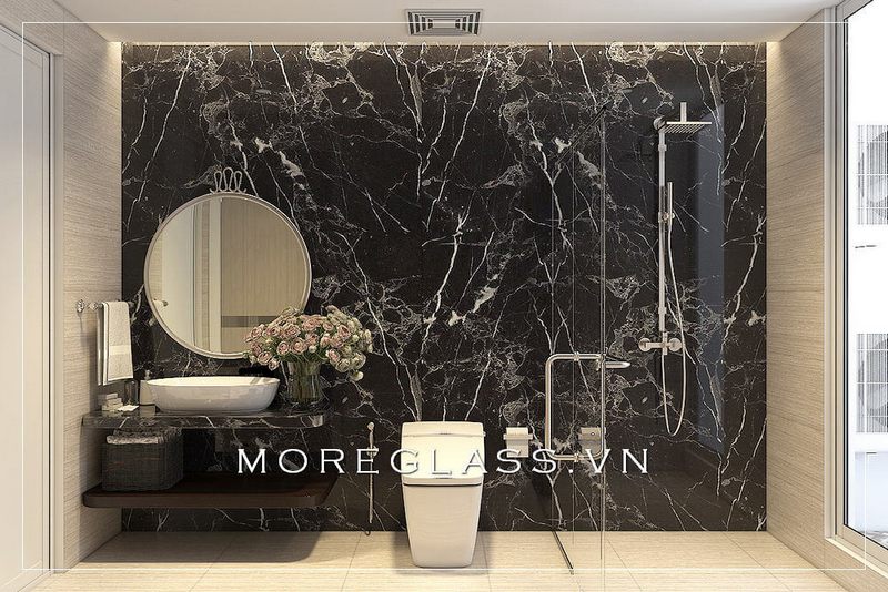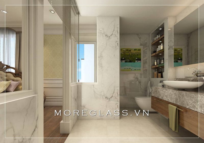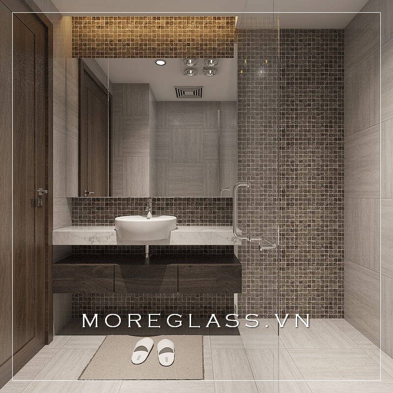 Phòng tắm chung cư được trang trí với các thiết bị vệ sinh hiện đại, bao gồm các gương trang trí, đá ốp tường và vách tắm kính.