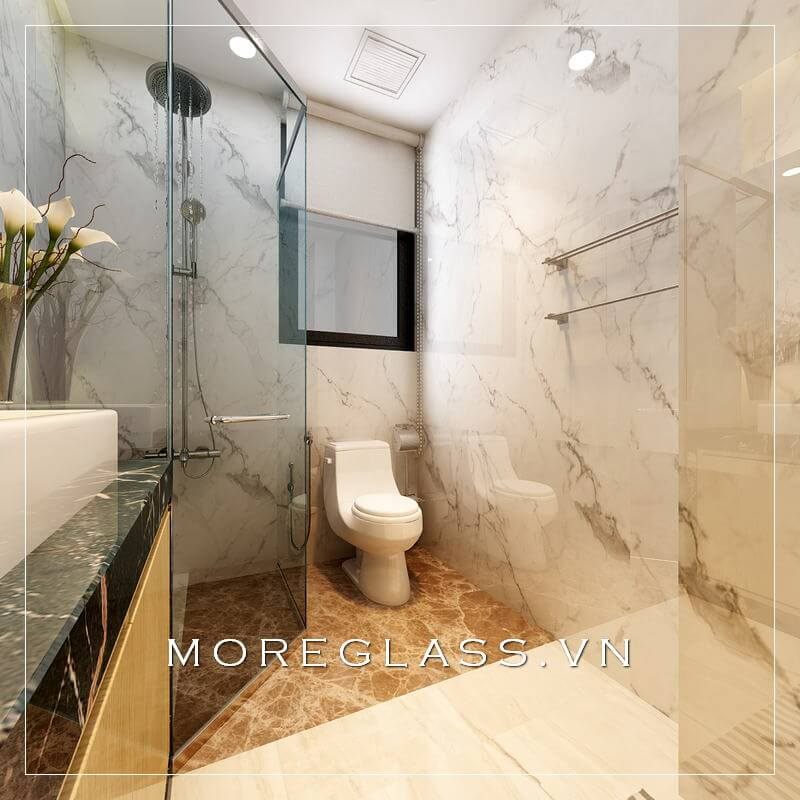 Mẫu thiết kế nhà vệ sinh hiện đại sử dụng vách kính đứng để tách biệt hai khu vực tắm và vệ sinh, giúp tạo ra cảm giác rộng rãi trong phòng.