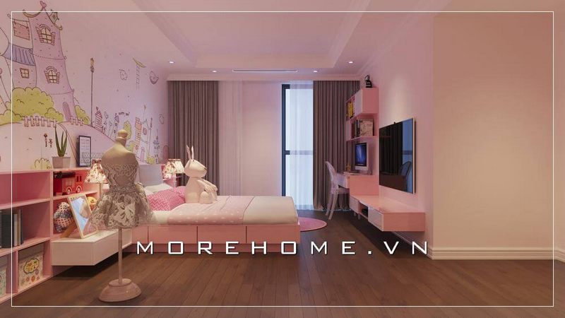Mẫu thiết kế nội thất phòng ngủ có sự kết hợp đẹp mắt giữa gam màu hồng nữ tính và công chúa.