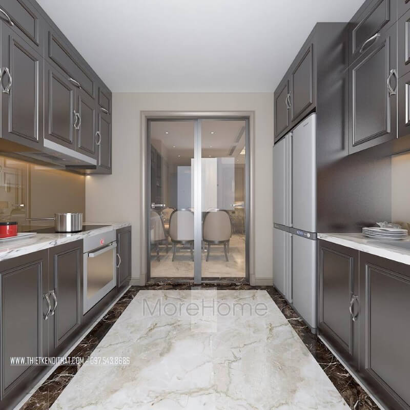 Nội thất phòng bếp chung cư hiện đại với tủ bếp chữ i gỗ công nghiệp màu xám